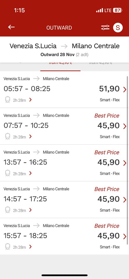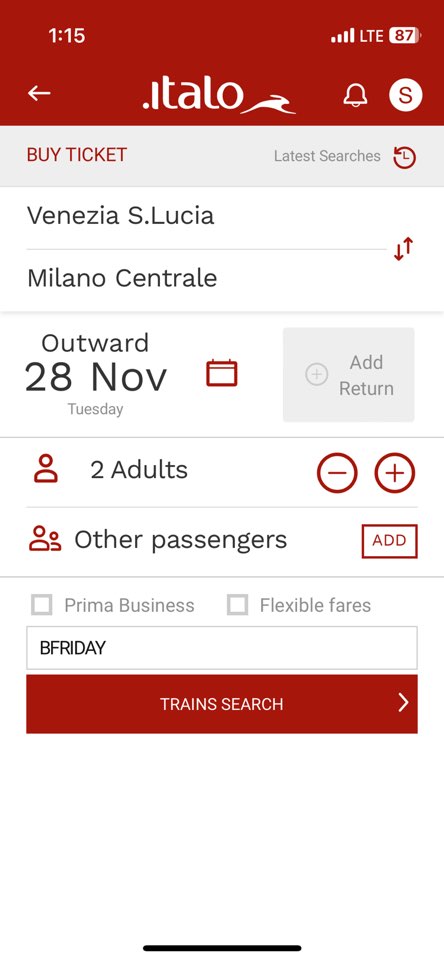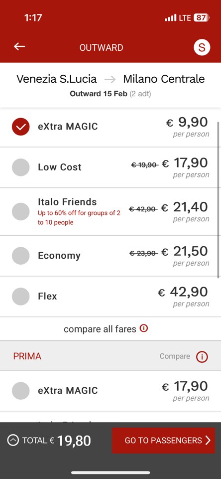 기차 등급은 4등급이 있는데 smart(1열 4석), prima (1열 3석) , * Smart – 이것은 Italo 기차의 기본 좌석 등급입니다. 편안한 좌석, 무료 Wi-Fi, 그리고 영화나 TV 프로그램을 볼 수 있는 Italo Live 멀티미디어 서비스에 접근할 수 있습니다. * Comfort – 이 등급은 더 넓은 공간과 편안함을 제공합니다. Smart 등급의 모든 혜택과 함께, 추가로 넓은 좌석 간격과 조절 가능한 등받이를 제공합니다. * Prima – Prima 등급은 더 많은 편의 시설과 서비스를 제공합니다. 여기에는 넓은 좌석, 무료 음료와 스낵, 환영 서비스, 그리고 개별 멀티미디어 화면이 포함됩니다. ( Club Executive – 이것은 Italo 기차의 최고급 좌석 등급입니다. 프라이빗한 분위기의 좌석, 고급 식사 옵션, 개인 멀티미디어 화면, 그리고 회의실 사용 가능성과 같은 최상의 편의 시설과 서비스를 제공합니다. 여기에 예약변경이 가능한 Flex, Ecomomy 요금이 있는데 Ecommony 로 선택하면 기본좌석인 Smart 보다 저렴하게 예약을 할 수 있습니다. 베네치아에서 밀라노 갈때 Smart 요금이 1인당 €45정도였는데, 미리 예약해서 그런지 Prima 등급을 1인 €17.90에 예약했습니다. Italo에서 Black Friday를 맞아서 크게는 아니지만, 조금씩 할인이 되었던것 같다.