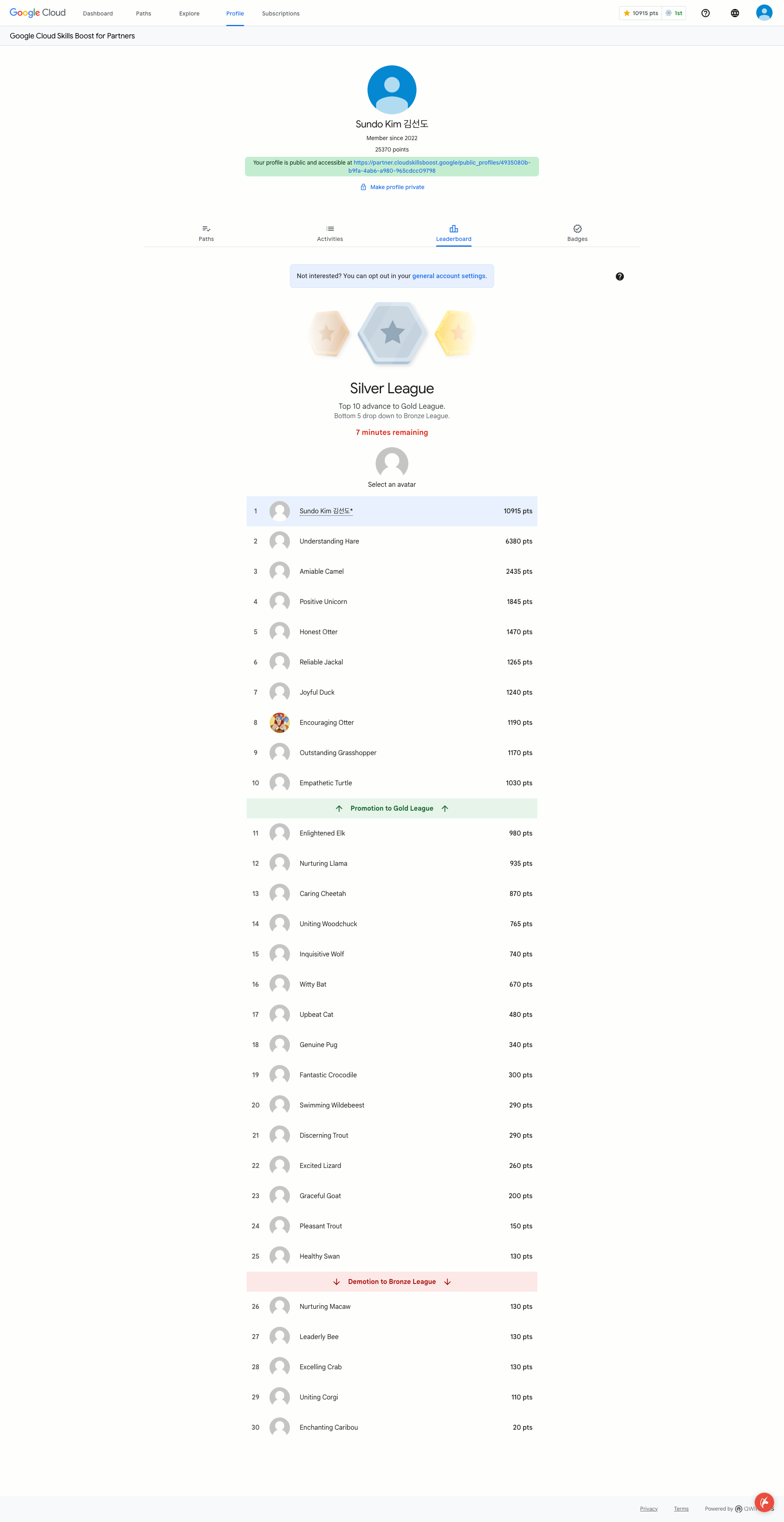 다행히 경쟁자가 갱신되지 않고 있습니다. 처음 생겼을때 재미있어서 전세계 Google Cloud Skills Boost 를 진행하시던 분들과 재미있는 경험을 하였습니다.
