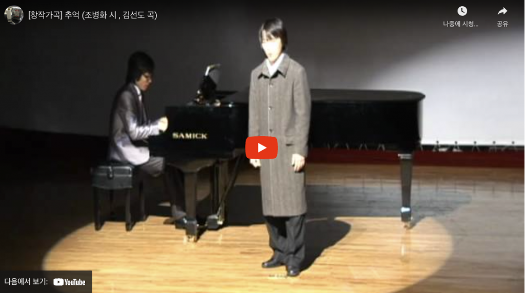 곡 정보 창작년도 : 2006년 초연 : 2006년 창작가곡제촬영년도 : 2008년 성악 : 오지명피아노 : 김홍배 가사 : 조병화 시